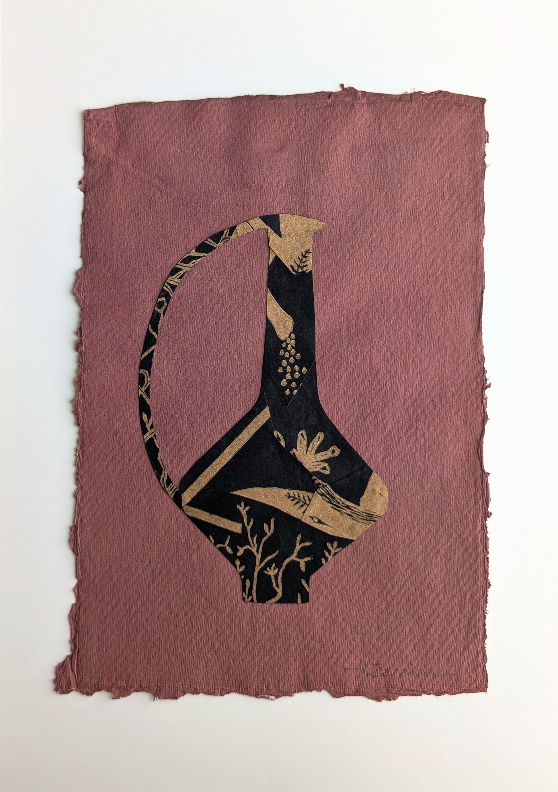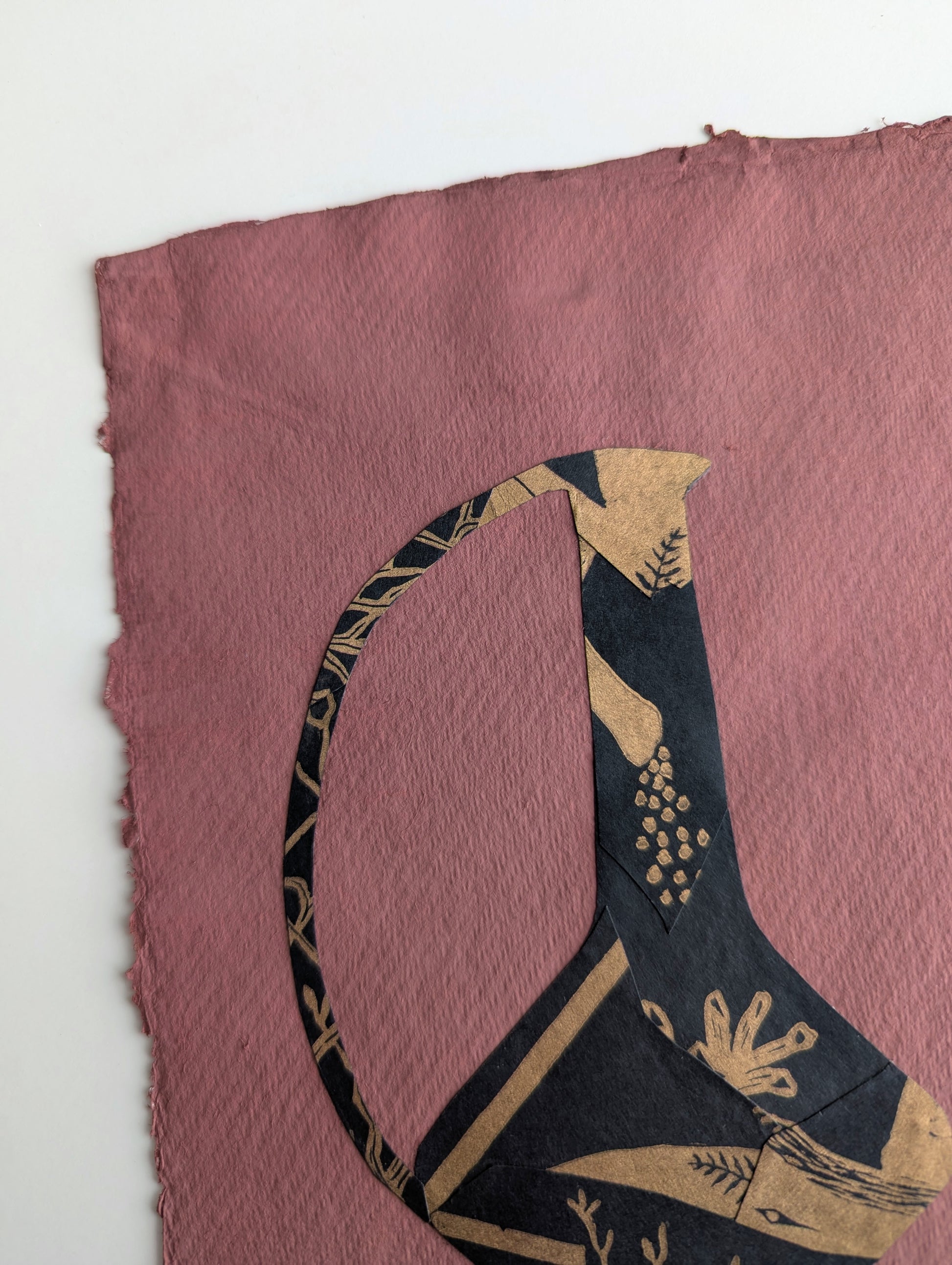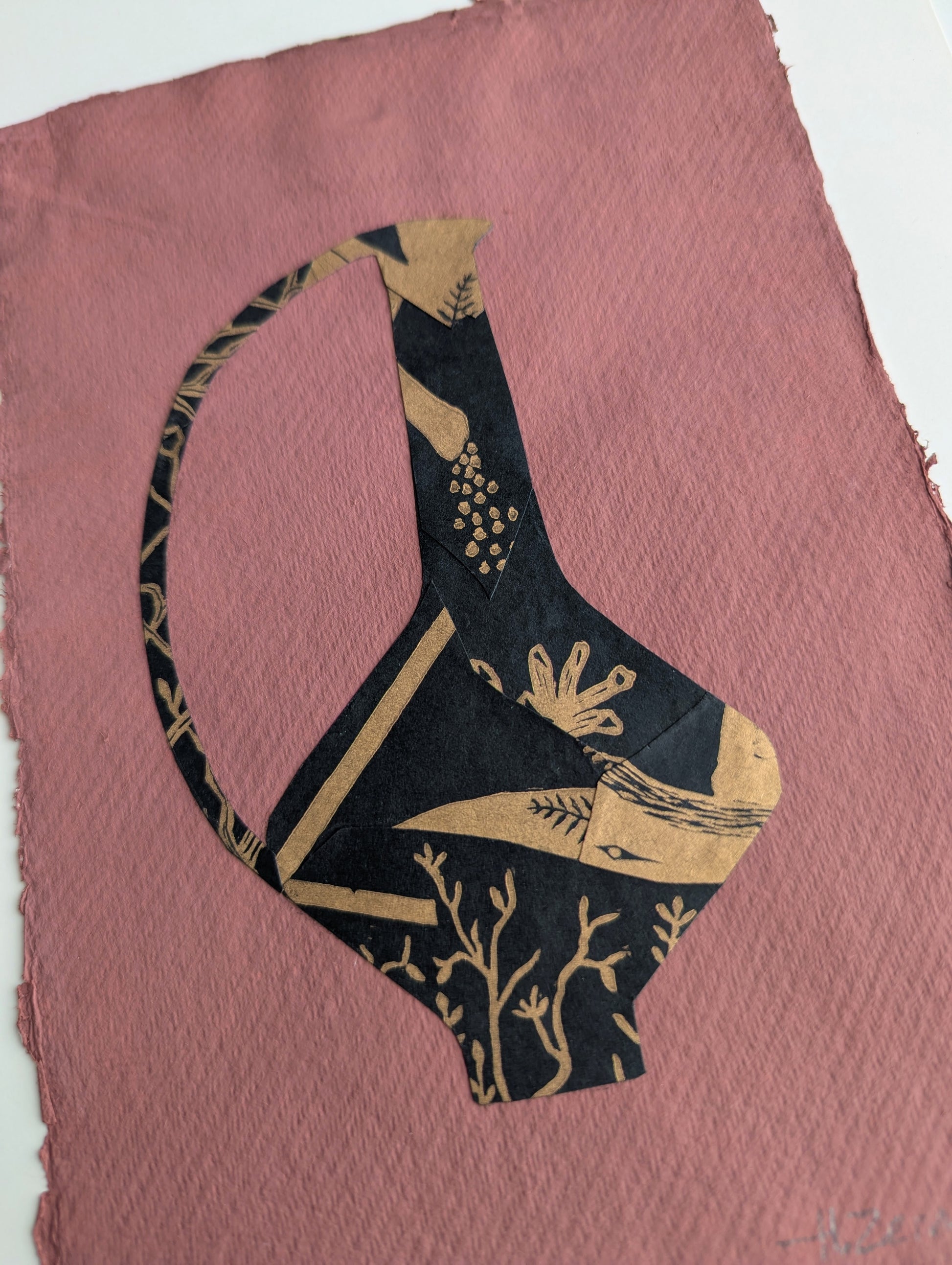 Gouache and collage on cotton rag. Collage made from the misprints of an old linocut, with the intention of giving new life to something that would otherwise end up in trash.