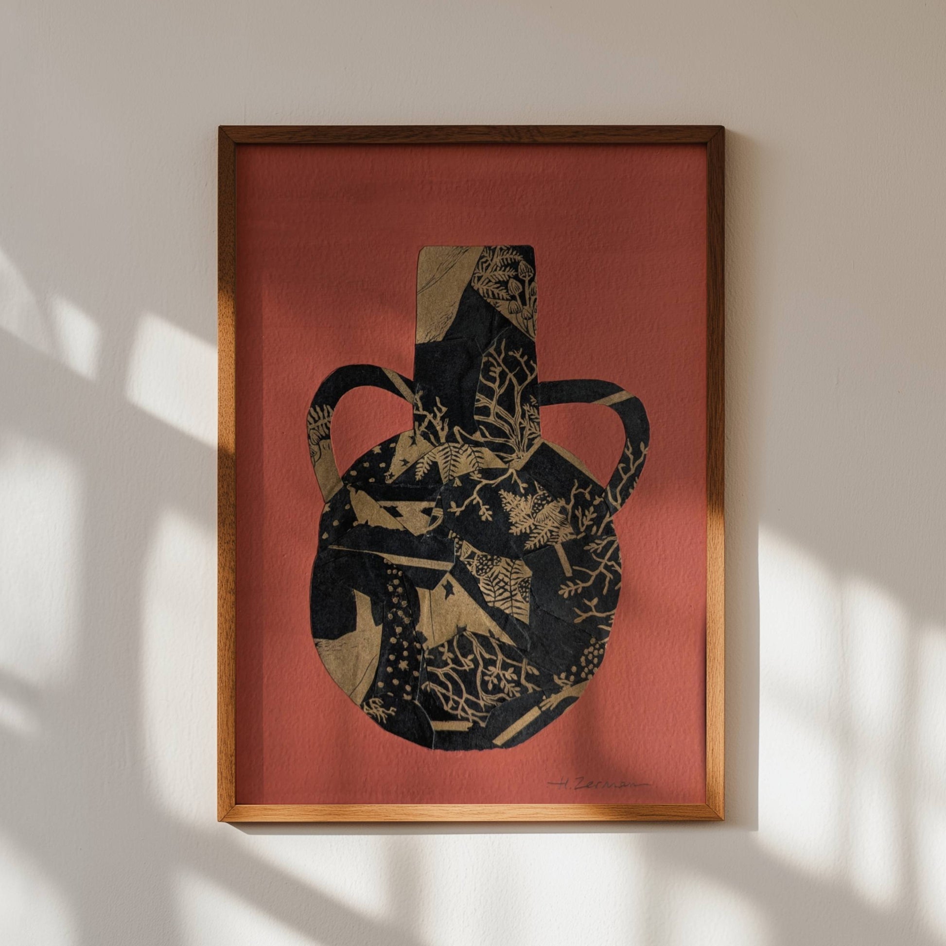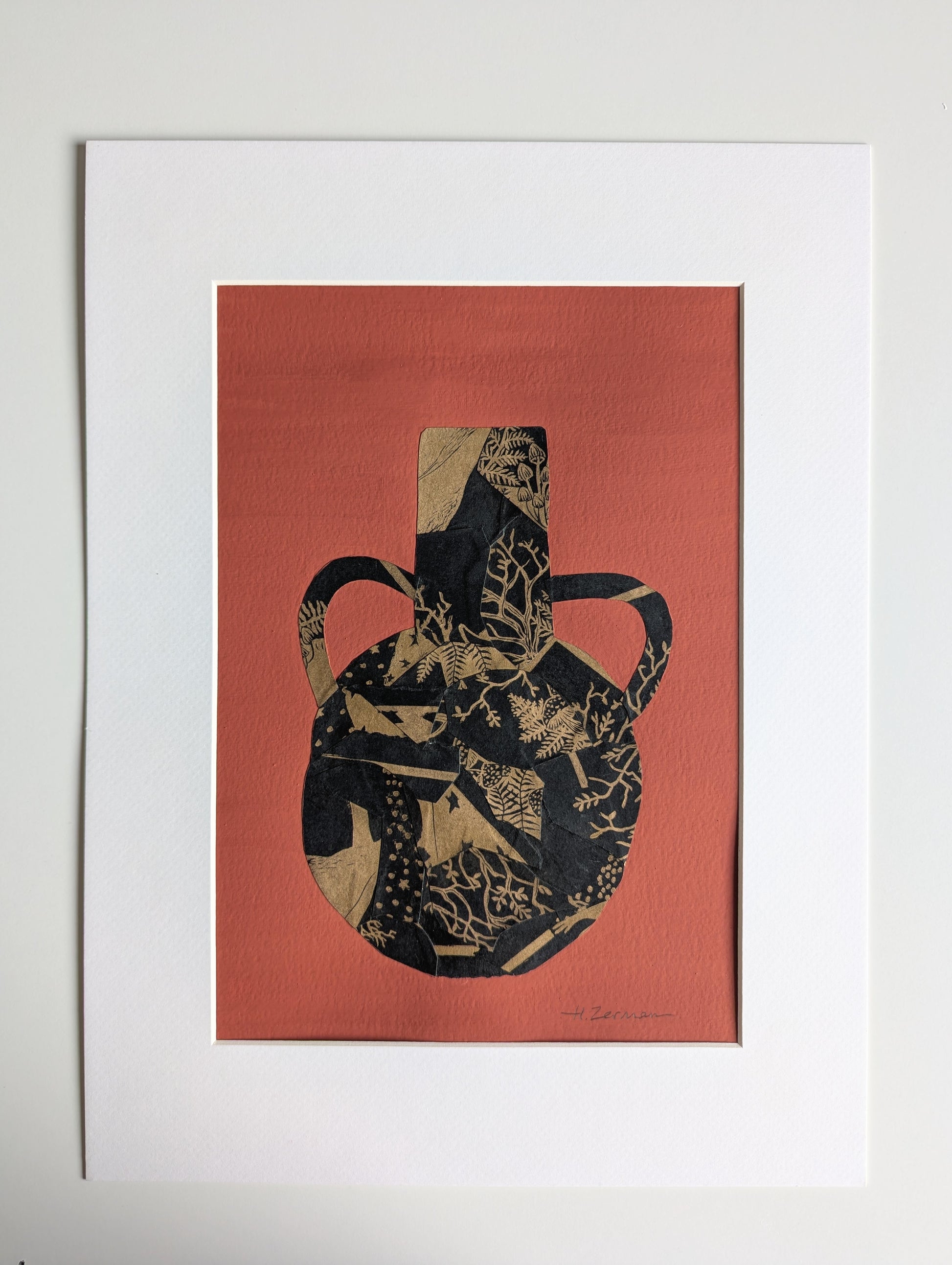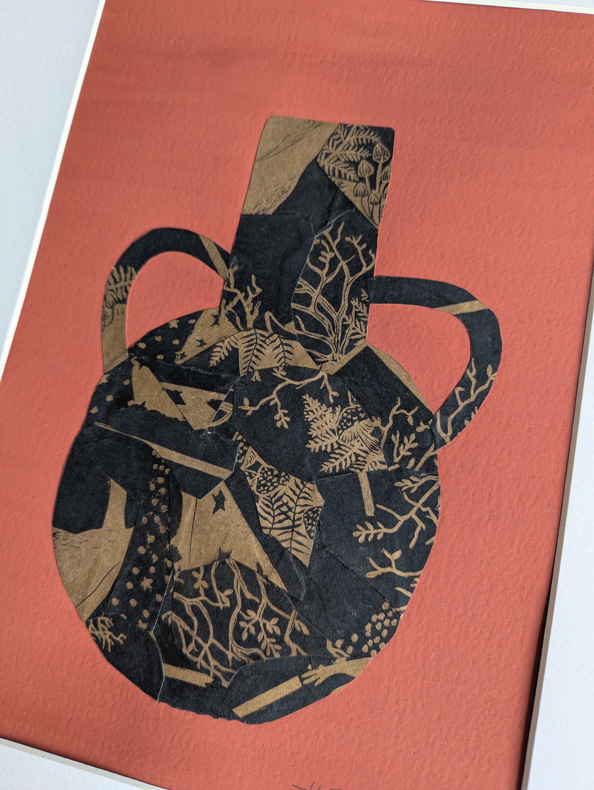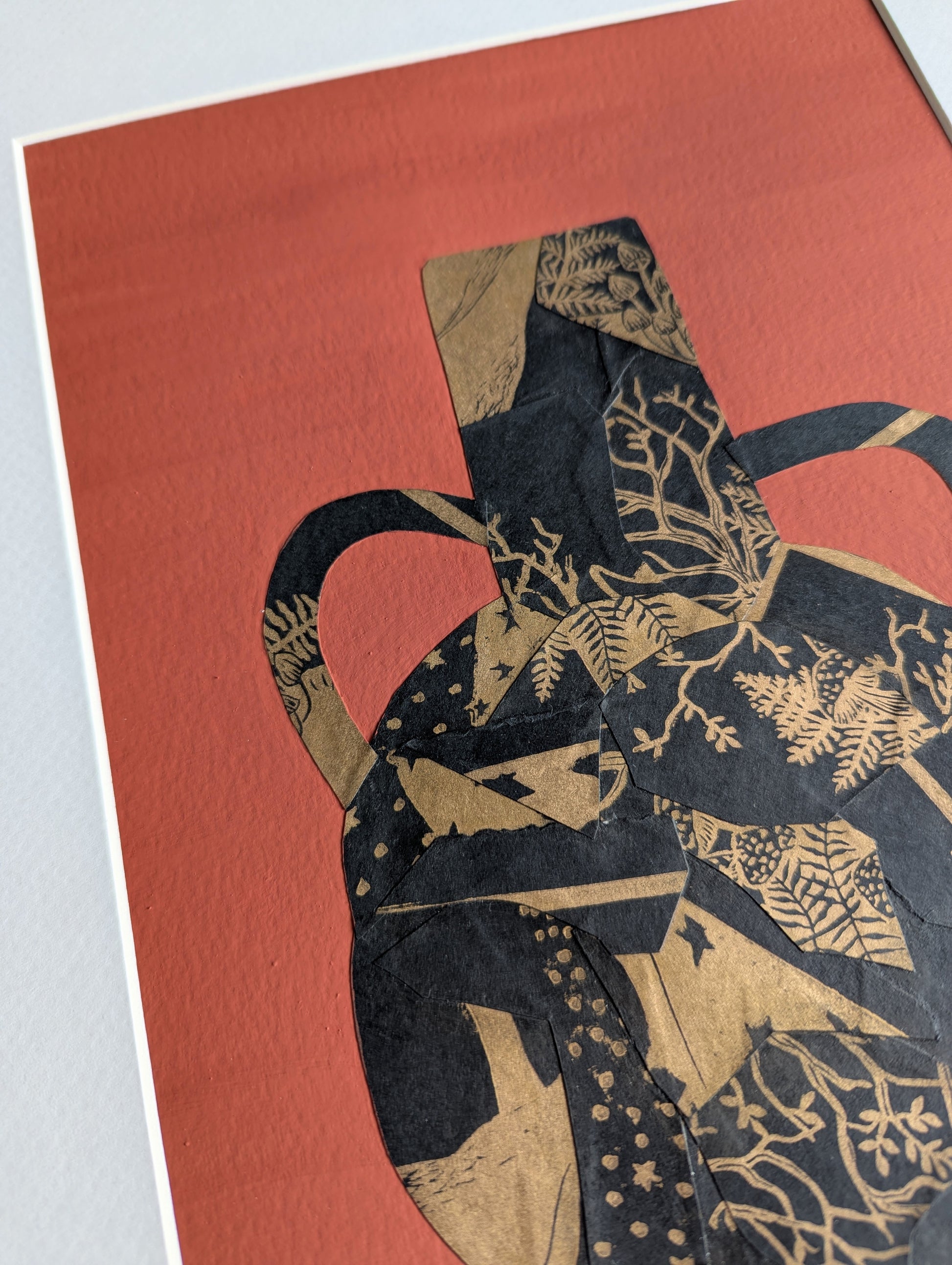 Gouache and collage on paper. Collage made from the misprints of an old linocut, with the intention of giving new life to something that would otherwise end up in trash.